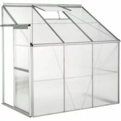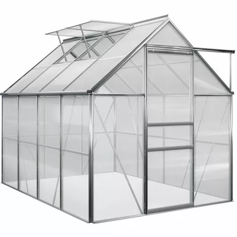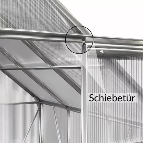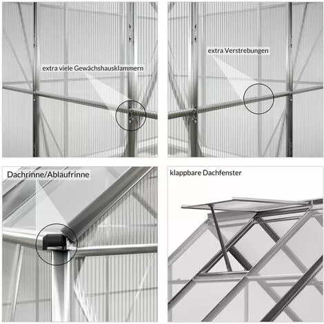 Serre de jardin de haute qualité et stable avec 2 lucarnes de toit et gouttière, constituée de panneaux en polycarbonate à double-paroi profilés en aluminium anodisés. Les lucarnes de toit pliables et pratiques assurent une ventilation optimale. La gouttière dirige l’eau de pluie du côté vers le bas. Ainsi, vous pouvez récupérerl”eau de pluie avec des récipients appropriés et la réutiliser.