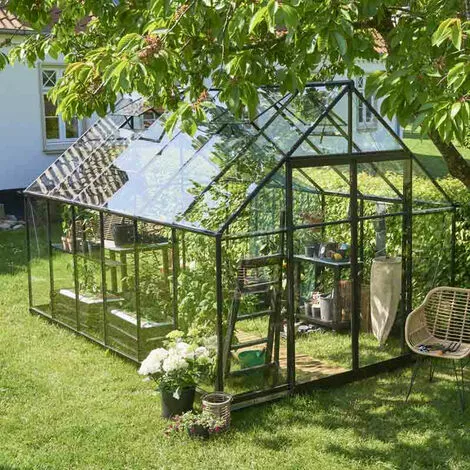 Avec son style moderne et minimaliste, la serre de jardin Qube+ 812 de 9.90 m² est conçue avec des profiles en aluminium, qui lui garantissent robustesse et longévité.