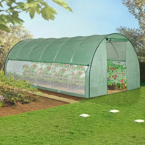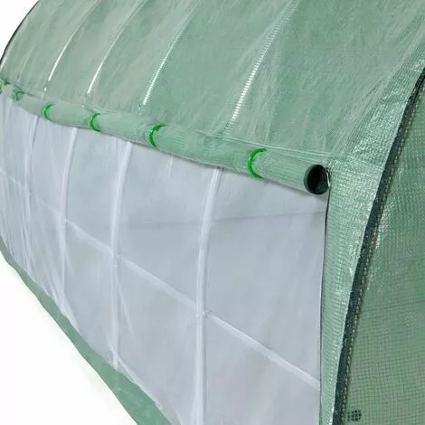 Vous souhaitez disposer d’un grand et beau potager en pleine santé pour des récoltes fructueuses toute l’année ? Craquez pour la serre de jardin 18m² avec moustiquaire intégrée !Simple à installer, la serre de jardin 18m², lorsqu’elle est fermée, vous permet de garder vos plantations de fruits et légumes à l’abri du froid et de l’humidité. Grâce à sa bâche en PE 140gr/m² anti-UV soyez assurés que vos jeunes poussent grandissent dans un microclimat idéal à leur développement. Relevez la bâche à mi-hauteur d’un côté ou bien des deux, et offrez à vos plantations soleil et aération aussi longtemps que nécessaire. En effet, grâce aux moustiquaires intégrées, vos fruits et légumes pourront pousser tranquillement tout en étant protégés des oiseaux, insectes ou encore rongeurs. Protégées du froid, de la pluie et des nuisibles, vos jeunes pousses pourront évoluer dans une grande serre de 18m² et disposer de tout l’espace dont elles ont besoin pour se développer. Grâce à sa grande porte zippée de L.125 x l.180 cm, vous pourrez entrer et sortir aisément de la serre avec tout votre matériel de jardinage et circuler librement pour arroser, désherber ou récolter vos fruits et légumes. Composée de 7 arceaux, de 4 barres de renforts, d’une structure en acier galvanisée et de fixations supplémentaires avec cordes et sardines, cette serre vous garanti stabilité et robustesse même en cas de fortes pluies, neige ou grêle. Pour encore plus de stabilité et une meilleure protection de vos plants, nous vous conseillons également d’enterrer les extrémités de la bâche. Assurez-vous des fruits et légumes goûteux et délicieux tout l’année, grâce à la serre tunnel avec moustiquaire 18m² ! Dimensions de la serre tunnel de jardin 18m² avec moustiquaire- Dimensions hors tout : Longueur 300 CM x largeur 600 CM x Hauteur 200 CM- Surface : 18m²- Matériaux : Structure en acier galvanisée – Bâche PE 140gr/m² anti-UV- Coloris : Vert- Nombre d’arceaux : 7- Tubes : 25 MM de diamètre- 1 porte d’entrée zippée : L.125 x H.180 CM- 2 clips pour tenir la porte- Bâche relevable à mi-hauteur des 2 côtés- Moustiquaire sur les côtés- Fermeture zippée sur les longueurs pour relever la bâche + 12 crochets en plastique verts pour l’accrocher- 4 barres de renfort (anti tempête)- 4 cordes + 4 sardines pour fixation au sol – HORS CORSE -article non livrable en Corse