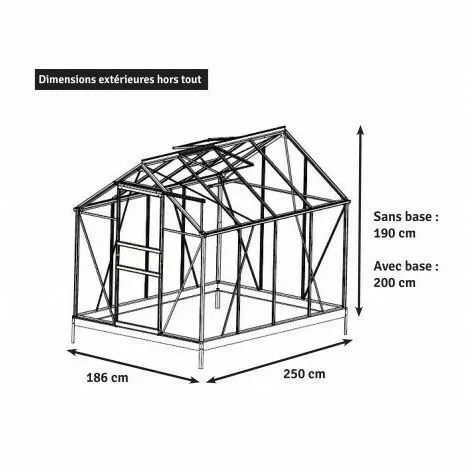 Dimensions extérieures hors tout avec la base (L x P x H) : 186 x 250 x 200 cm