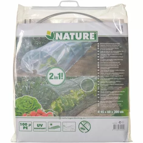 Facile à installer, le kit tunnel duo 2-en-1 se compose d’un film transparent et d’un voile anti-insectes. La largeur du tunnel est de 60 cm, la hauteur est de 45 cm et la longueur est de 300 cm. La hauteur de +/- 50 cm permet d’abriter des légumes assez hauts jusqu’à la récolte. Il se pique en terre au-dessus des semis. Le tunnel 2-en-1 protège les récoltes des insectes, des oiseaux, mais aussi du vent, du gel, … Utilisation facile.