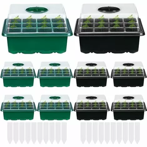 Ce que vous obtenez – Le plateau de démarrage pour graines contient : 10 x plateau de semences, 10 x plateau inférieur (5 verts et 5 noirs), 10 x dôme d’humidité (5 verts et 5 noirs), 2 x outils de jardinage, 20 x étiquettes de plantes (indispensables pour les semis).