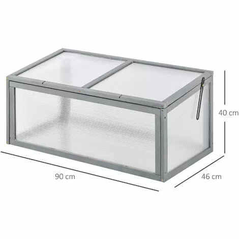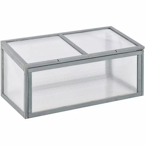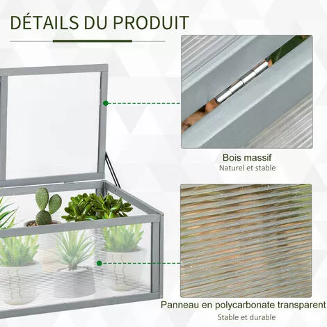 Cette jolie mini serre de jardin avec toit ouvrable vous permettra de protéger vos plantes, légumes, etc… durant l’hiver et le printemps. Sa conception et fabrication en bois de sapin pré-huilé pzint en gris et panneaux de polycarbonate vous assureront protection et rendement. Caractéristiques : – Mini serre de jardin en bois peint en gris mélant sobriété et élégance – Conception et fabrication de qualité en bois de sapin pré-huilé et panneaux de polycarbonate pour protéger vos plantes, légumes, etc… et ainsi optimiser leur rendement – Toit ouvrable avec pattes de support : ventilation optimale, entretien plus facile de vos plantes – Toit en pente favorisant l’écoulement de l’eau de pluie – Panneaux alvéolaires de polycarbonate transparent favorisent la diffusion permanente de la lumière du soleil et la croissance de vos plantations – Montage facile, rapide à l’aide du manuel d’assemblage illustré fourni Spécifications : – Couleur : gris – Matériaux principaux : bois de sapin pré-huilé, panneaux de polycarbonate – Dim. totales : 90L x 46l x 40H cm – Dim. espace interne : 86L x 42l cm – Hauteur avant : 34 cm – Hauteur arrière : 39 cm – Livraison effectuée en un colis – Réf. : 845-379V01