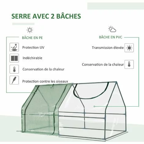 Cette mini serre de jardin protègera efficacement vos plantes afin d’en tirer le meilleur rendement possible. Equipée de 2 bâches et 2 fenêtres déroulantes avec zip et cordons de maintien, d’une structure an acier thermo-laqué, et d’une bâche rallongée, vous pourrez sereinement lancer votre nouvelle production agricole.