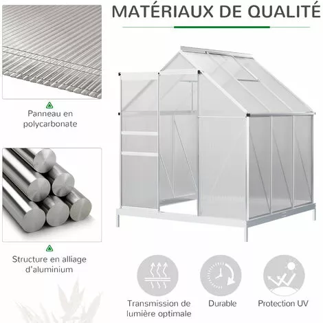 – Châssis robuste et stable en aluminium anodisé avec panneaux double paroi en polycarbonate alvéolé isolant et anti-UV de 4 mm