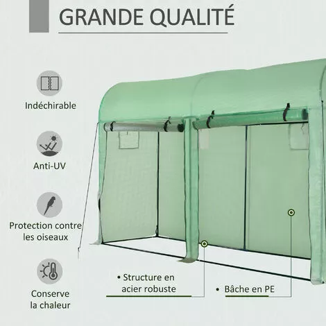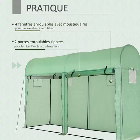Cette serre de jardin protègera efficacement vos tomates ou autres plantes afin d’en tirer le meilleur rendement possible. Equipée de 2 portes déroulantes avec zip, de 4 fenêtres refermables, d’une structure an acier thermo-laqué et d’une bâche en PE haute densité 140 g/m², vous pourrez sereinement lancer votre nouvelle production agricole. Caractéristiques : – Serre de jardin serre à tomates idéale pour protéger vos plantes contre le froid, la pluie, les insectes, oiseaux, etc… et ainsi favoriser leur croissance et optimiser leur rendement – Bâche en polyéthylène imperméable anti-UV haute densité 140 g/m² (cordons de serrage à la structure inclus) rallongée de 10 cm pour un ancrage optimal dans le sol – 2 portes enroulables avec zip et boucles d’attache afin de vous adapter parfaitement aux conditions climatiques – 4 fenêtres zippées enroulables avec moustiquaires facilitent l’observation de la croissance de vos plantes et leur ventilation – Structure châssis en acier thermo-laqué pour un usage pérenne – 4 cordons de serrage et 4 piquets d’ancrage au sol inclus – Montage démontage + entretien facile (manuel illustré fourni) – Note : veuillez ne pas utiliser de pesticides pour éviter de détériorer la bâche Recommandé d’enterrer les extrémités de la bâche pour plus de rigidité de l’ensemble Specifications : – Couleur : vert – Matériaux principaux : acier thermo-laqué, PVC et polyéthylène haute densité 140 g/m² – Dim. totales : 3L x 1l x 2H m – Dim. fenêtres : 35L x 35l cm – Dim. portes : 130l x 145H cm – Longueur cordons de serrage : 150 cm – Longueur piquets d’ancrage au sol : 14 cm – Diamètre châssis tubulaire : 1,9 cm – Accessoires fournis : 4 cordons de serrage, 4 piquets d’ancrage au sol – Livraison effectuée en un colis – Réf. : 845-416