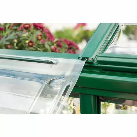 La serre Harmony est livrée avec une base pour assurer la stabilité de la structure, une porte avec charnière et une lucarne pour assurer une ventilation efficace.