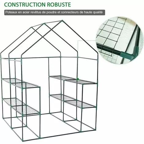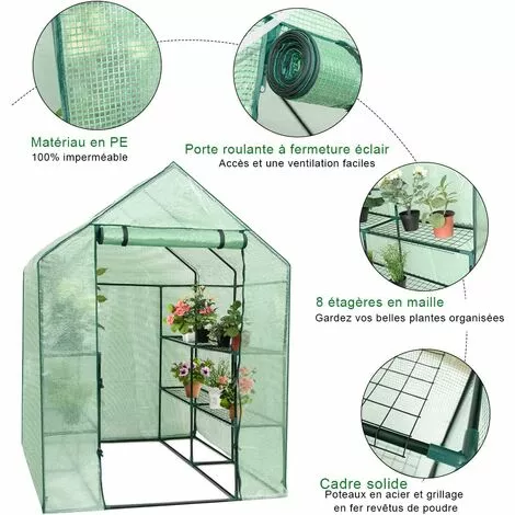 Notre serre avec étagères créera un environnement de croissance stable pour vos plantes! Les 2 côtés de l’intérieur avec étagères vous permettent de placer les plantes. La bâche imperméable crée la bonne température de croissance pour vos plantes. La portes avec fermetures à glissière facilite l’entrée et la sortie. La serre peut être placée dans les cours et les fermes, c’est le lieu de croissance idéal pour les plantes, les fleurs et les légumes.