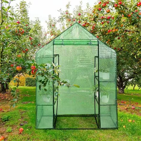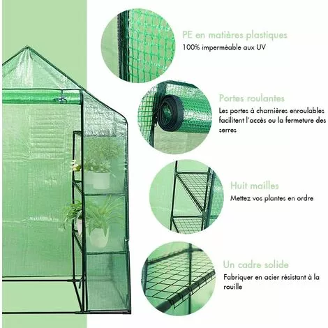 Notre serre avec étagères créera un environnement de croissance stable pour vos plantes! Les 2 côtés de l’intérieur avec étagères vous permettent de placer les plantes. La bâche imperméable crée la bonne température de croissance pour vos plantes. La portes avec fermetures à glissière facilite l’entrée et la sortie. La serre peut être placée dans les cours et les fermes, c’est le lieu de croissance idéal pour les plantes, les fleurs et les légumes.