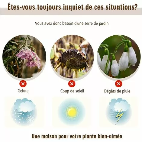 - ★STRUCTURE STABLE★ Le cadre de la serre est en métal pour bloquer les vents forts. La bâche de protection en matériau de haute qualité peut bloquer la pluie. La bâche peut être fixée au sol avec des piquets pour assurer des performances d’isolation thermique.